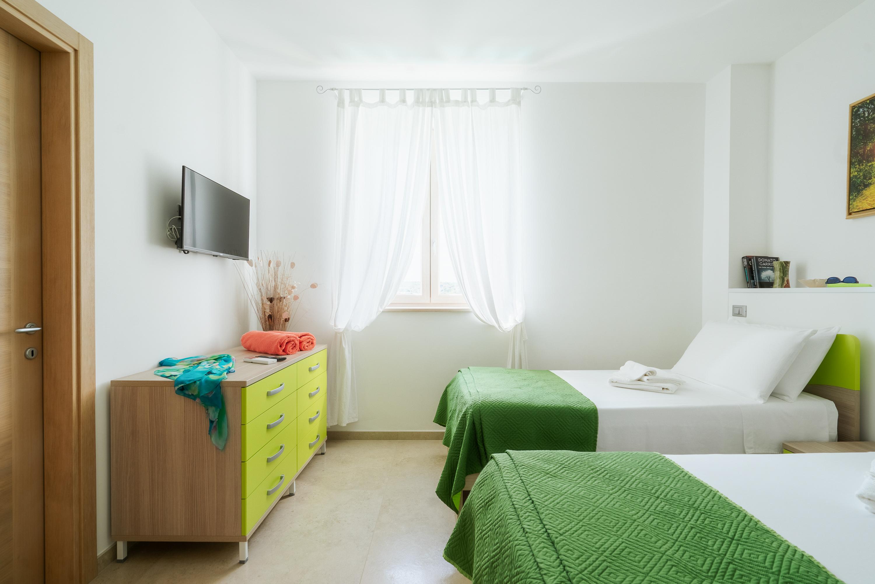 2- A typical stone Lamia with a living room, kitchenette, a double bedroom with a private bathroom, and a bedroom with two single beds and a private bathroom.